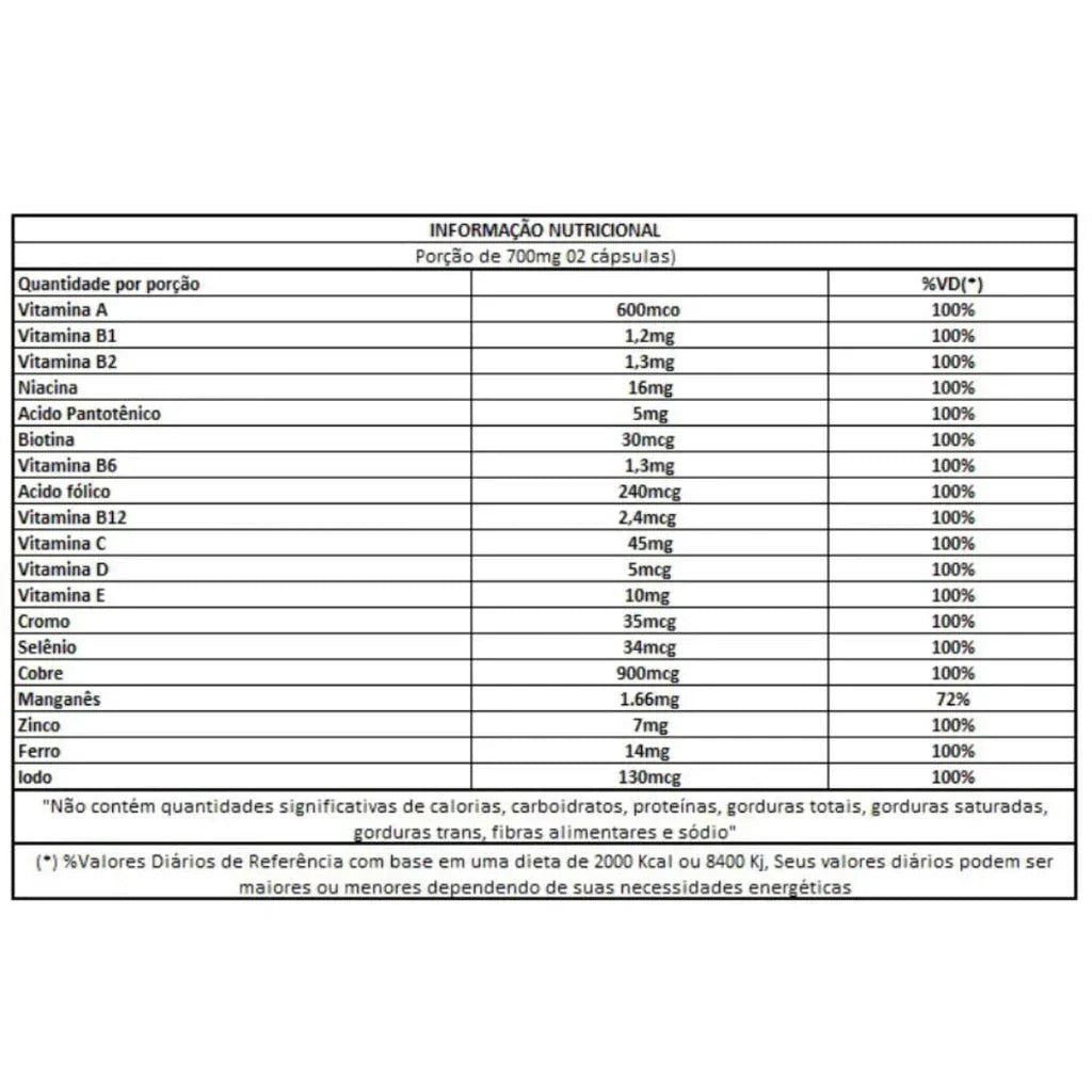 Minerais: Zinco, Ferro, Selênio, Cálcio, Magnésio, Fósforo, Iodo, Manganês, Cobre, Cromo